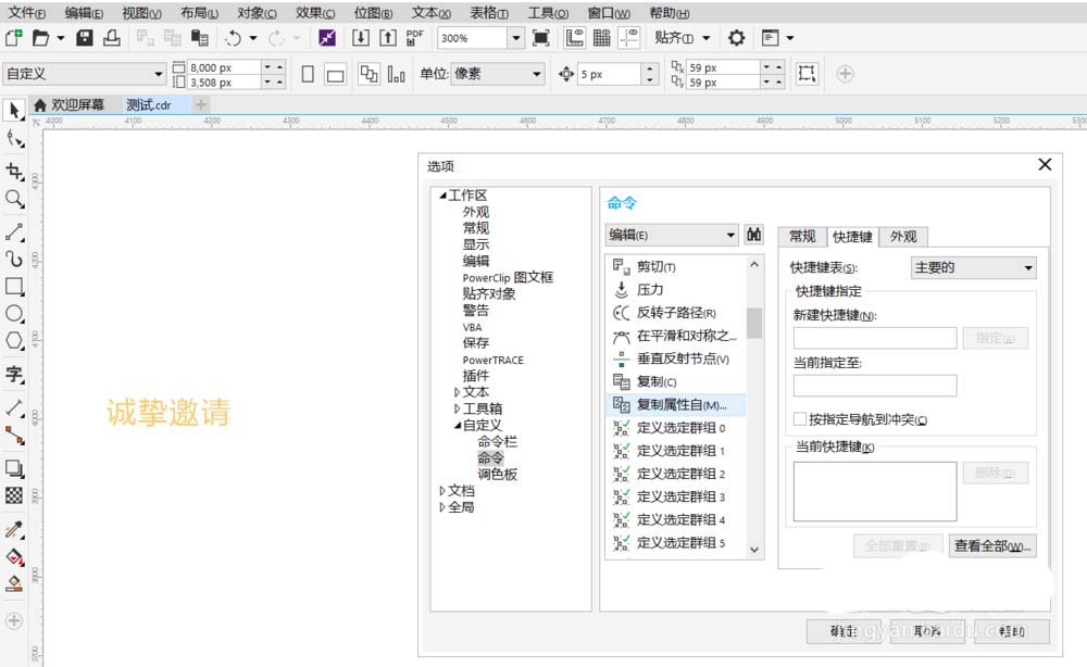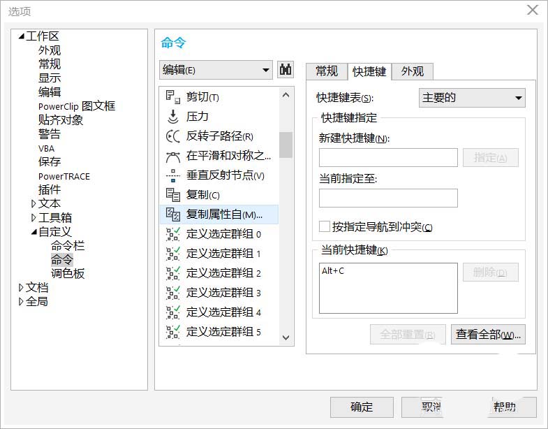 4、如果用工具欄比較麻煩,可以使用快捷鍵,不過,X8沒有快捷鍵,需要我們自定義。位置在:工具/自定義/選項找到復制屬性