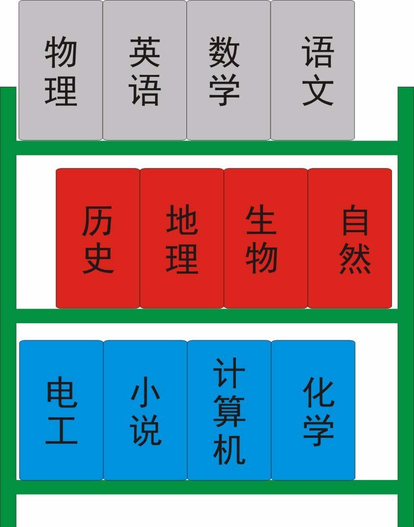 5、再把書架上面第一層的四本書復制到第二層和第三次上面去,分別把書本的名字改為自然、生物,地理、歷史,電工、小說、化學等名字,如下圖所示。