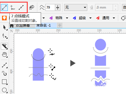 3、選擇刻刀工具,在2點線模式下,可以沿一條直線拆分對象。如果要以 15 度的增量約束線條,請按住 Shift + Ctrl。