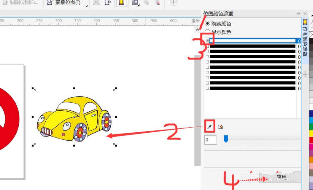 7、點(diǎn)擊位圖-位圖顏色遮罩,用吸管吸取車子外的顏色,以此隱藏白色來去掉背景色