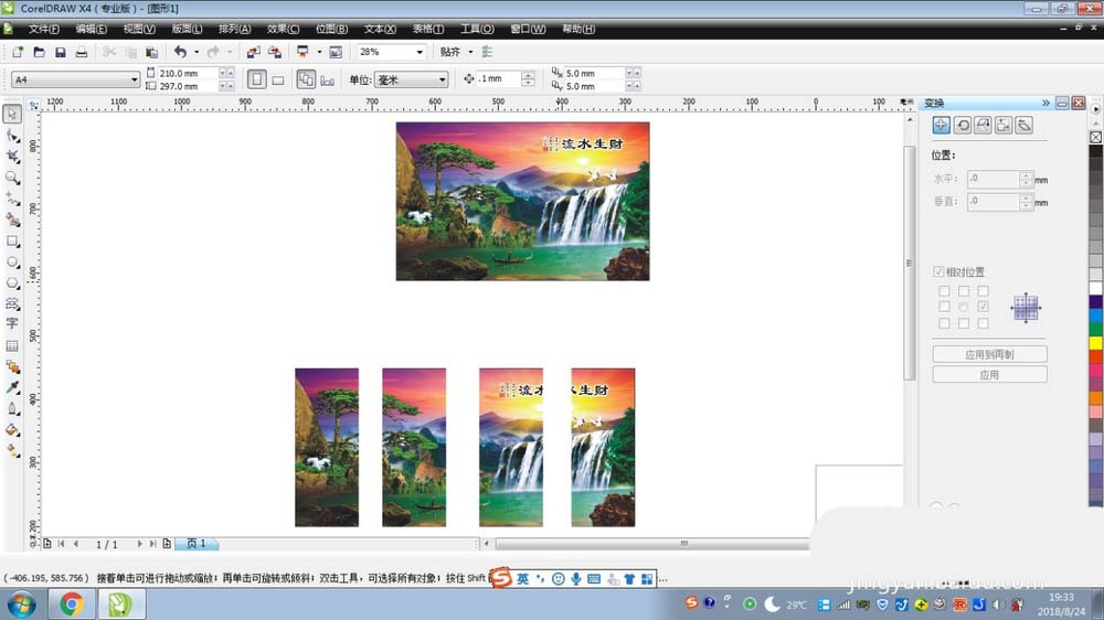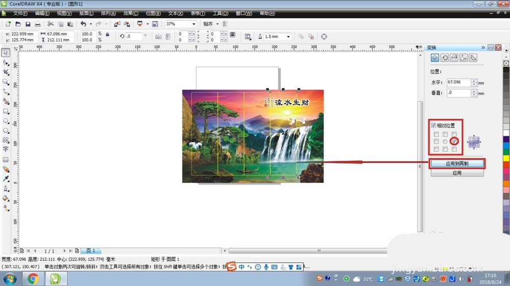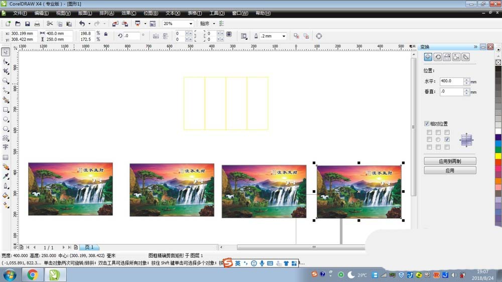 4、然后群組上面的四個小四方形,依次把下面的山水圖片精確裁剪到四個小四方形里面,然后在取消群組,就可以把山水圖形分割成四份。