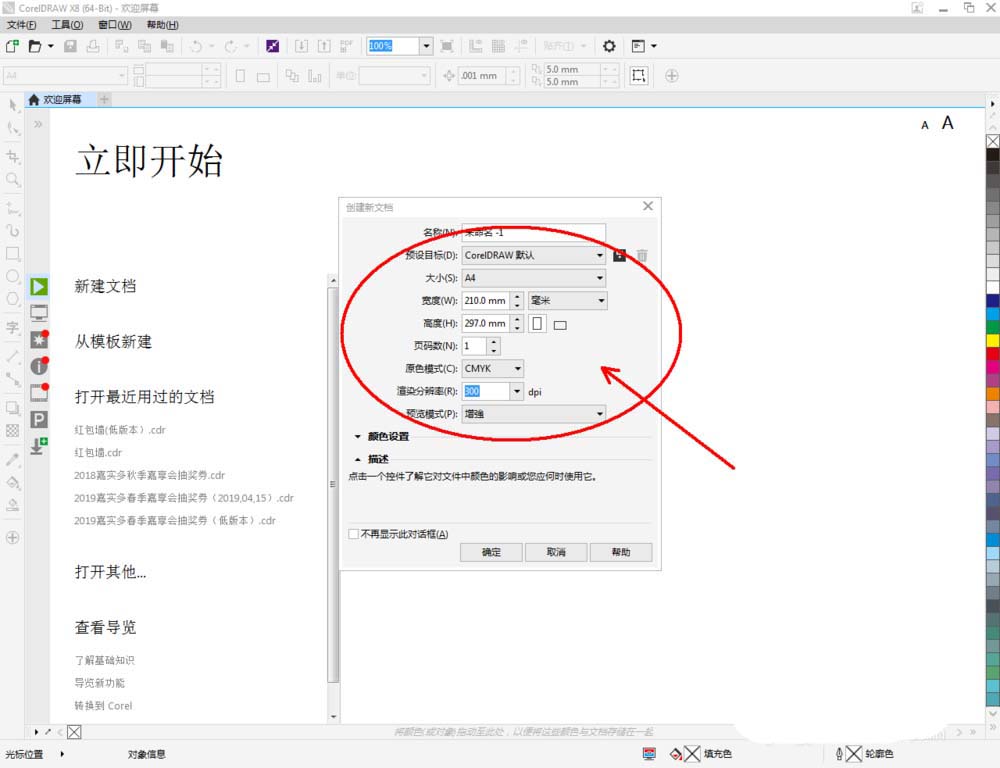 1、打開CorelDRAW X8 軟件,點擊【新建文檔】,按圖示參數新建一個cdr文檔(如圖所示);