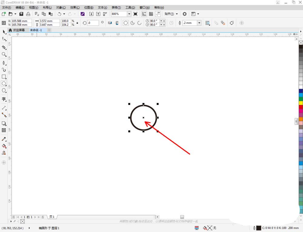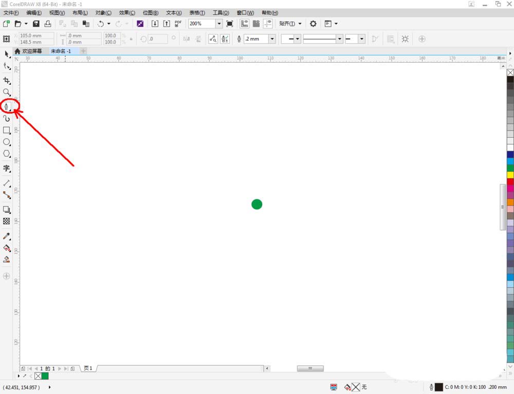 2、點擊【橢圓形工具】在作圖區域繪制一個圓形圖案后,鼠標左鍵點擊右邊色板中的綠色色塊,將圖案填充為綠色;鼠標右邊點擊右邊色板中的×,去除圖案描邊(如圖所示);