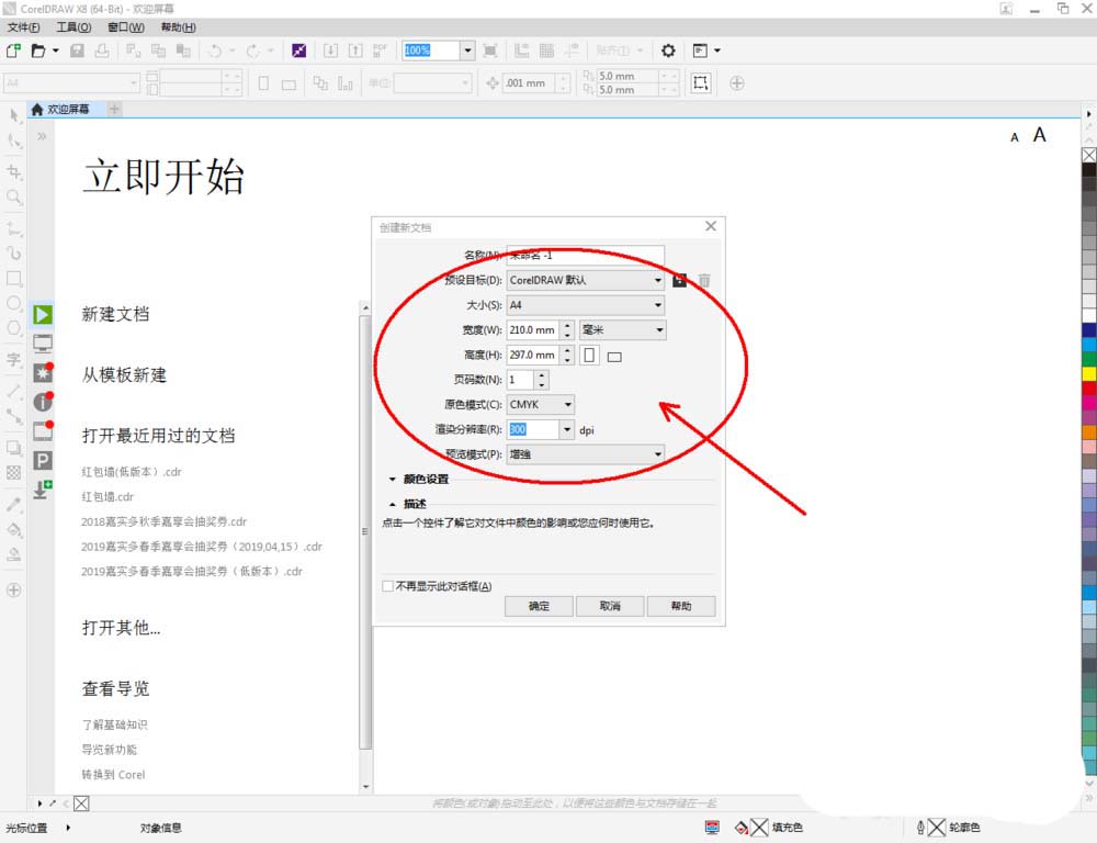 1、打開CorelDRAW X8 軟件,點擊【新建文檔】,按圖示參數新建一個cdr文檔(如圖所示);