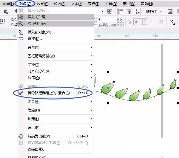 7、框選所有對象,單擊“對象”菜單→拆分路徑群組上的混合,選第一個樹葉復制并鏡像和選最后一個樹葉復制并鏡像,如圖: