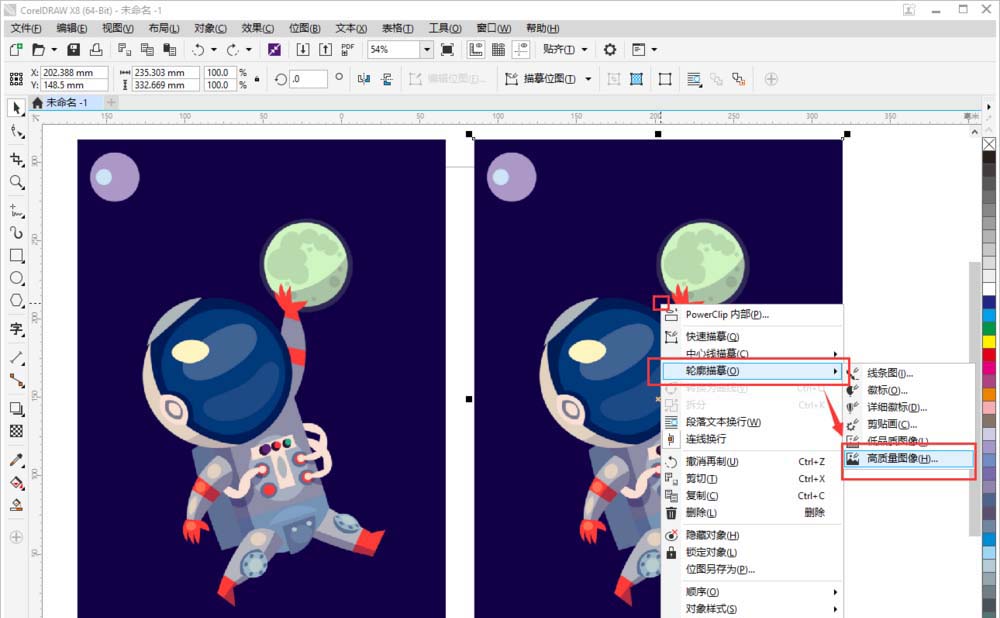 1、我們重新復制一個位圖,鼠標右鍵選擇【輪廓描摹】-【高質量圖像】。