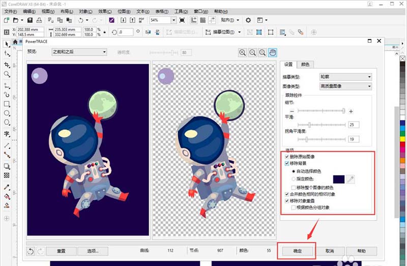 2、在彈窗中可以看到,軟件已經默認為你對圖片進行了矢量圖處理,通過右側的【細節】【平滑】【拐角平滑度】,來調整細節部分,在左側可以看到調整好的預覽效果。