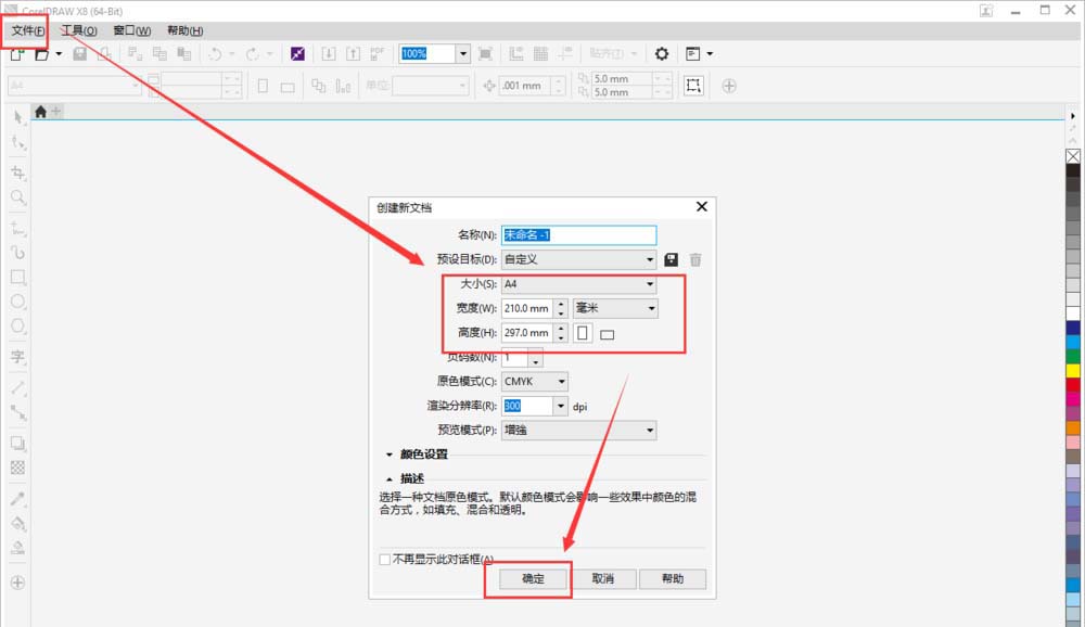 1、啟動CDR軟件,在左上角點擊【文件】-【新建】,默認選擇A4大小的文檔,點擊確定。