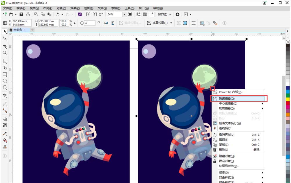 1、鼠標右鍵右邊的圖片,在下拉菜單中選擇【快速描摹】,軟件就會自動為你轉換成矢量圖。