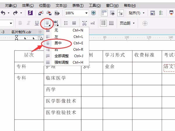 7、單元格文字居中,光標(biāo)放入單元格后單擊屬性欄中的“文本居中”和“垂直居中”中的“居中”,只能一個一個單元格居中。