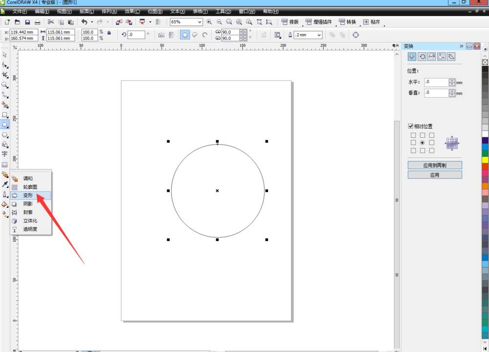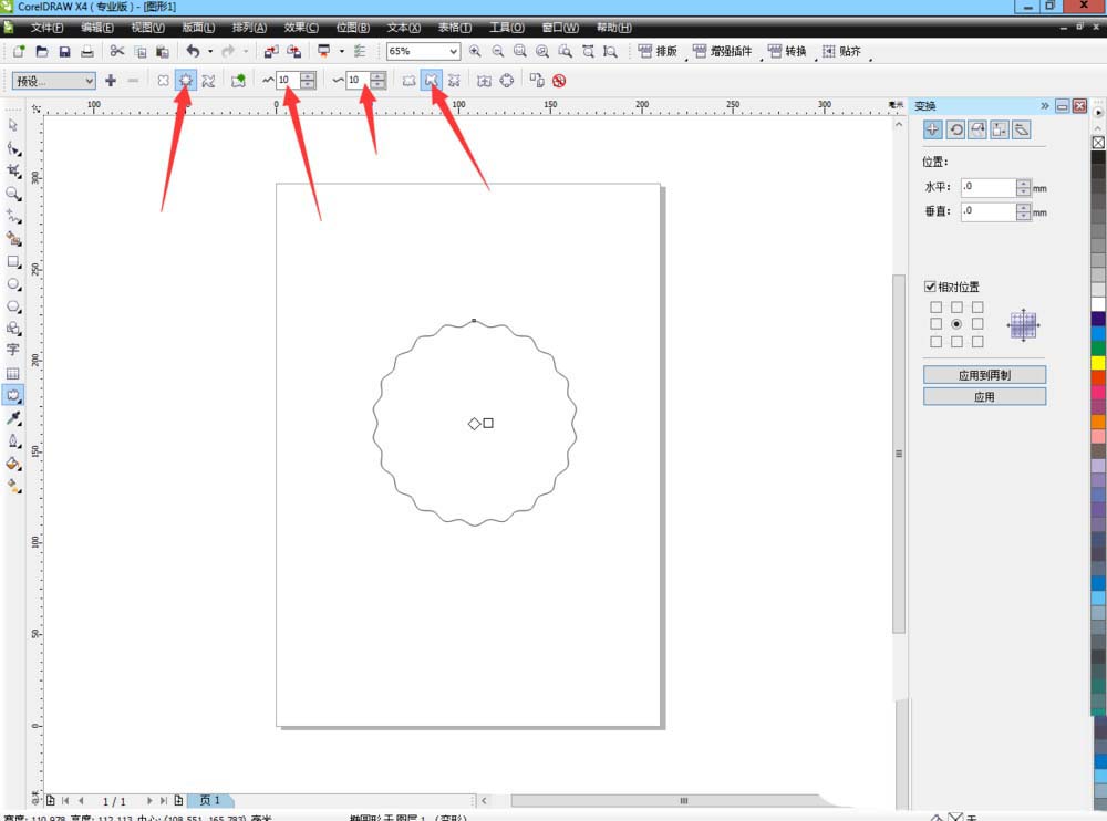 3、選中圓單擊變形工具對(duì)其進(jìn)行參數(shù)設(shè)置。在"變形工具"屬性欄做如下設(shè)置:拉鏈變形、在拉鏈振幅和拉鏈頻率中分別輸入波形的波峰到波底的值、波浪線個(gè)數(shù),然后再點(diǎn)擊后面的平滑變形,即可生成標(biāo)準(zhǔn)的波浪線。