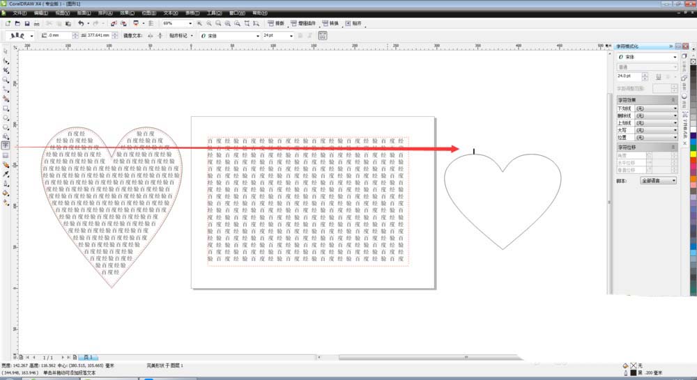6、在文檔中拖拽出一個心形,把文字復制進去,如下圖所示,
