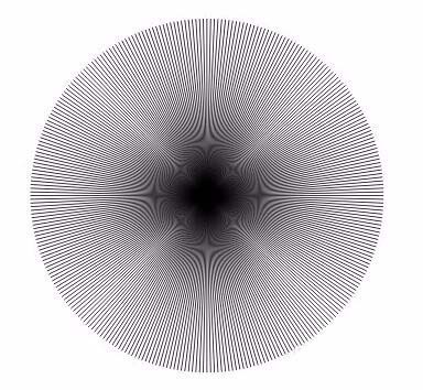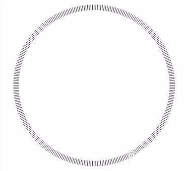 7、參照前面幾步,再話一條192.85mm、輪廓為1.411mm的直線,旋轉30度多次復制,再做一條直徑為172mm的正圓,后減前。第七步:畫一個比前面的圓更大一點的圓,并置于底層,去掉邊框,填充顏色為射線漸變:0%處為黑,20%處為90%黑,36%處為白,46%處為60%黑,100%處為白。