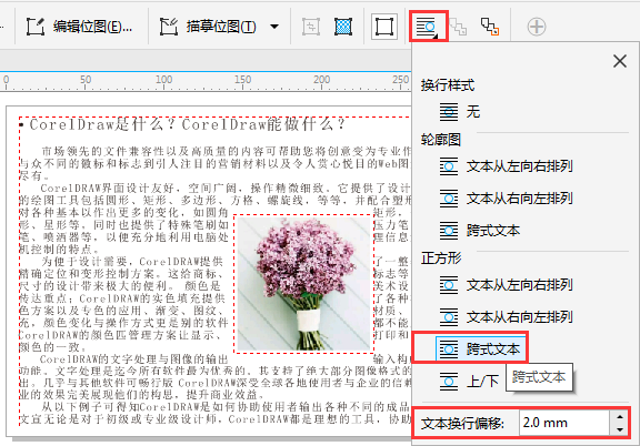 7. 選擇圖片,單擊屬性欄上的“文本換行”命令,此時會彈出關于“文本換行”的各種設置,根據需要,可進行選擇以實現多種文本繞圖效果,可以一一嘗試。這里我選擇“跨式文本”樣式,以現實文字繞圖排列的效果。