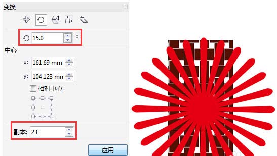7、旋轉(zhuǎn)并復(fù)制圖形。執(zhí)行“窗口”→“泊塢窗”→“變換”命令,在打開的“旋轉(zhuǎn)”泊塢窗中,設(shè)置具體參數(shù),設(shè)置旋轉(zhuǎn)角度為15度,在“副本”文本框中添加復(fù)制個數(shù),得到的效果如圖所示。