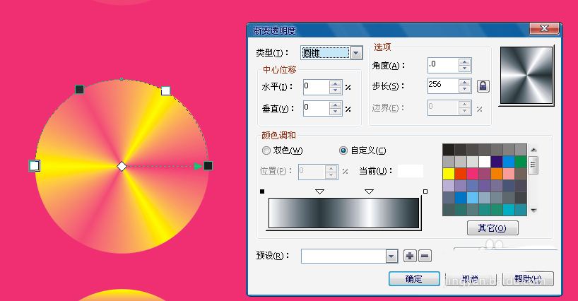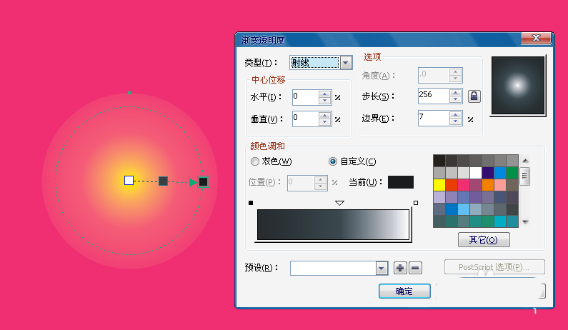 畫一個圓形,拉上射線透明,中間是黑色的就透明了,點(diǎn)擊屬性欄上面第一個圖標(biāo)打開漸變透明度對話框,把黑色和白色調(diào)整方向就做出了四周透明的效果,大家可以任意拉出自己想要的效果。