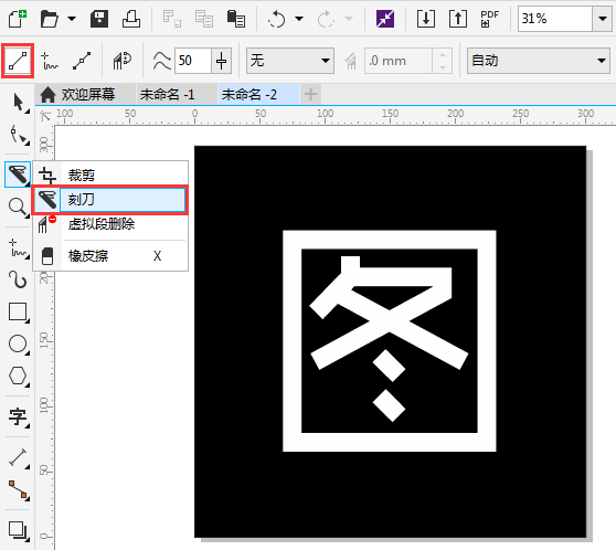 2. 選擇工具箱中“刻刀工具”,屬性欄設置模式為“2點線模式”,此模式可以沿直線切割對象,如圖所示。