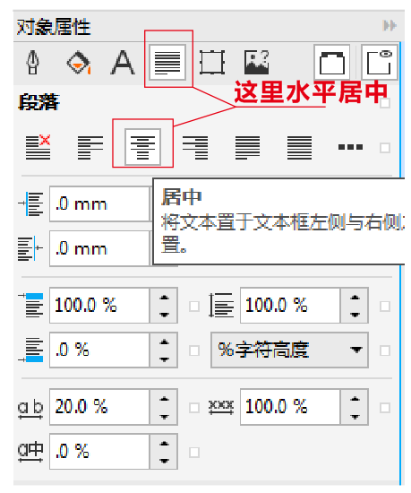 這里點擊只能垂直居中,水平居中需要進入對象屬性(ALT+ENTER)