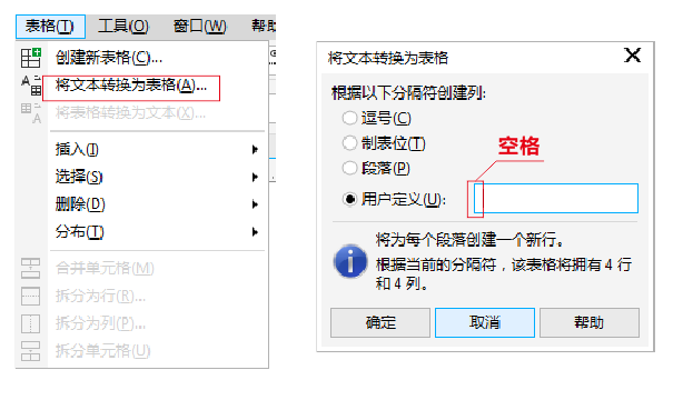 然后用選擇工具選中剛剛輸入的文本框,再進入"表格"菜單,將會看到"將文本轉換為表格"變黑色了,接下來點擊一下,就出現后面的對話框,選擇"用戶定義",在用戶定義后面的空框中輸入一個"空格",只打一個就可以了。