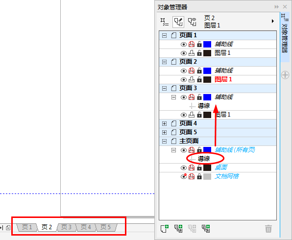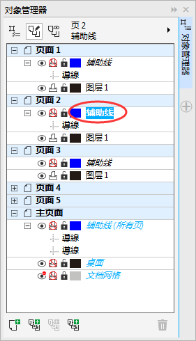 點擊菜單欄“窗口>泊塢窗>對象管理器”命令。軟件界面的右側即可看到圖層面板,默認狀態下,每個新建的文件都是由頁面1和主頁面構成。其中,在頁面1中包含“輔助線”;在主頁面中也包含“輔助線(所有頁)”,其實這兩個輔助線的用法是不同的。