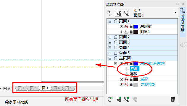 在CDR X8中新建文檔,并插入多個頁面,然后從標尺位置拖出輔助線,會默認添加到主頁面中的“輔助線(所有頁)”,即在插入的多個頁面中的相同位置都會顯示該導線,默認CDR導線是畫在主頁面上的,所在每個頁面都可以看到導線。