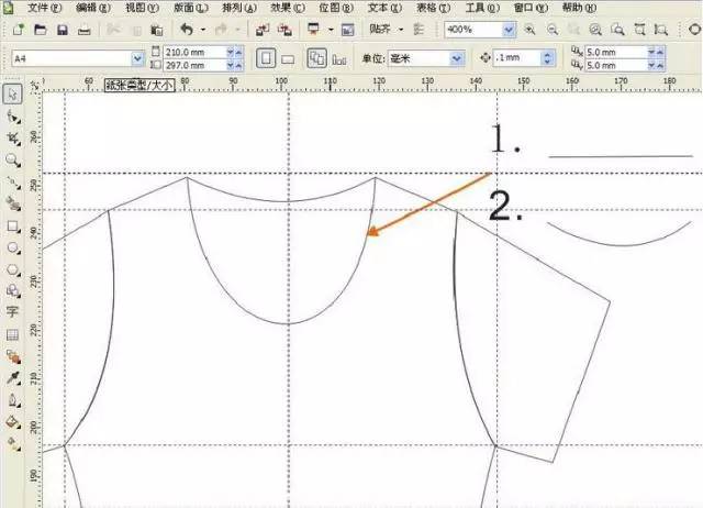 1、使用“貝塞爾工具”,繪制出衣片的基本形狀。(借助輔助線,盡量使衣片對稱)