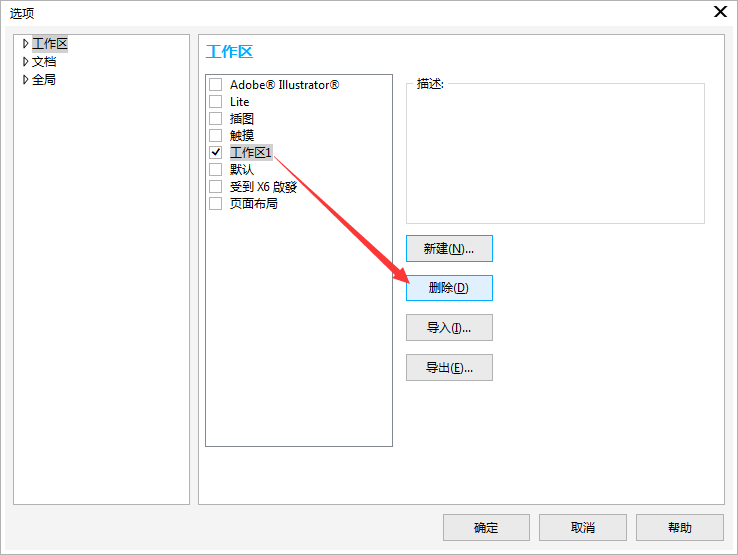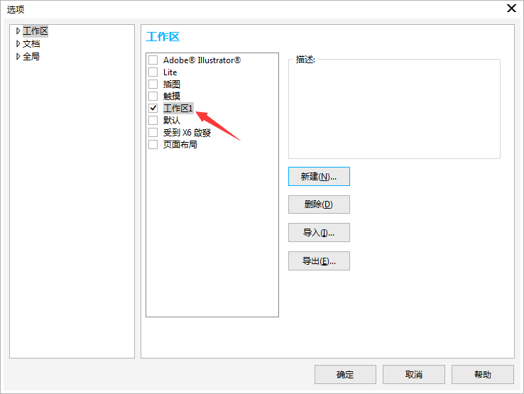 1. 執(zhí)行菜單欄的“工具>選項(xiàng)”(快捷鍵Ctrl+J),在彈出的“選項(xiàng)”對話框的左側(cè)欄中點(diǎn)擊“工作區(qū)”類型列表,面板右側(cè)單擊“新建”命令。