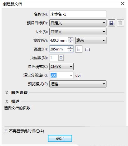 1、新建一文檔 寬430mm 高度285mm 顏色模式:cmyk;分辨率 300 設置完點確定。