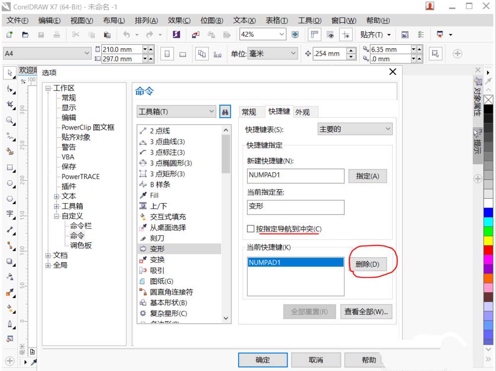 6、如出現指定的快捷鍵有沖突,可以刪除原有快捷設置