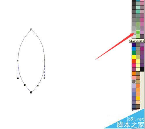 8、用鼠標點擊圓的下邊的節點上左右兩邊的節點頭,將節點左右兩邊的節點頭向上移動,得到下圖的效果。接著,將橢圓和輪廓和內部填充為淺綠色。