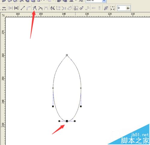 6、用鼠標點擊圓的上邊的節點上左右兩邊的節點頭,將節點左右兩邊的節點頭向下移動,得到下圖的效果。