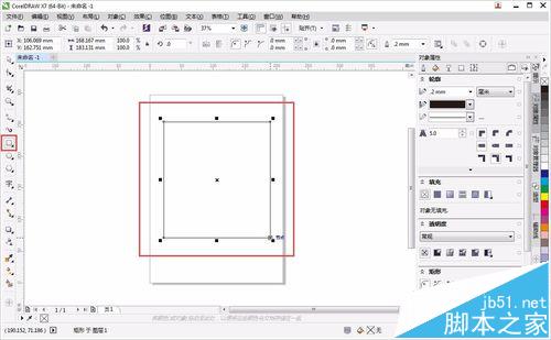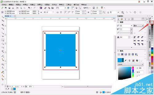 6、矩形填充為藍色后,我們發(fā)現(xiàn)周圍還有一圈黑色的輪廓線。現(xiàn)在我們選中藍色矩形色塊,選中右側的“默認調色板”鼠標右鍵點擊上方的去輪廓線圖標。把藍色色塊的黑色輪廓線去掉。