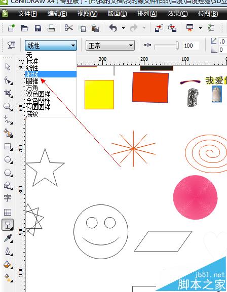 8、如圖所示,在彈出的下拉列表菜單中,我們點擊箭頭所指的“射線”這個選項。