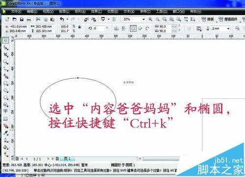 6、告訴友友們一個技巧,選中內(nèi)容和橢圓,按住快捷鍵“Ctrl+k"打撒,最后選中橢圓,按住快捷鍵”delete",刪除橢圓。如圖所示: