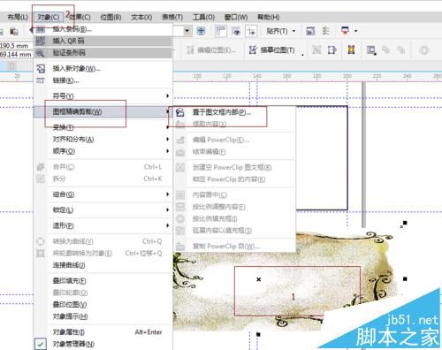 7、選中圖像,點擊“對象”-->圖框精切裁剪-->出來箭頭,選擇框,如圖。