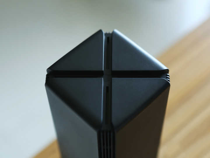細節方面,小米AX1800采用了與AX3600相似的設計語言,整體采用了黑色塑質為主體材質,并借由四邊的格柵開孔將整體分為四個部分,不僅有助于產品內部散熱,還增加了產品的棱角感和層次感。