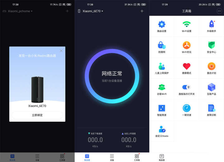 最后就是功能方面,小米AX1800在小米路由器App中可以進行非常多的詳細設置。AX1800可以為市面上各品牌主流的智能家居設備提供安全防護,一鍵檢測潛在漏洞。同時在設備列表中,用戶也可以看到自己家的WiFi網絡是不是被蹭網了,如果發現蹭網設備就可以對其進行封禁。
