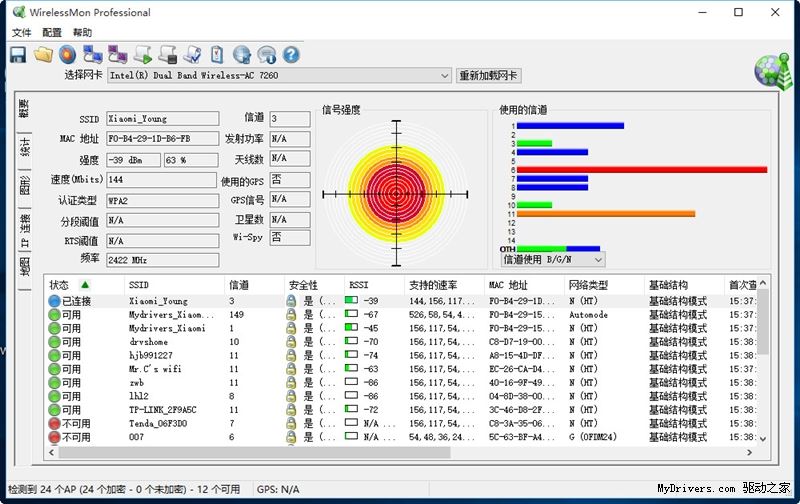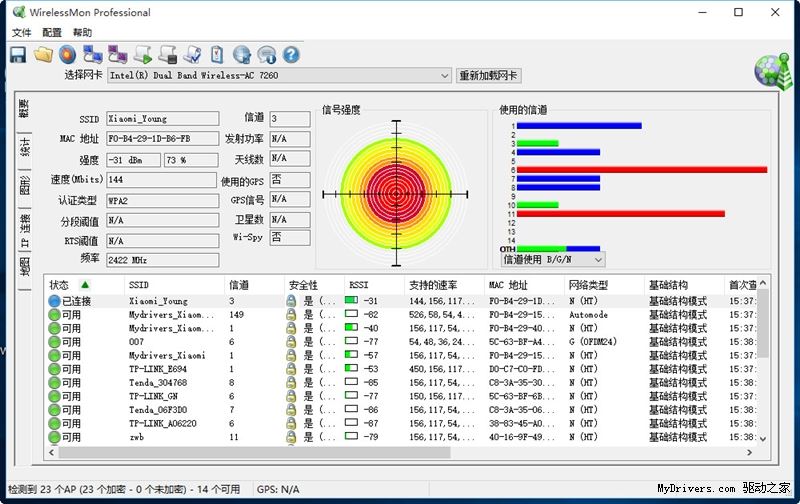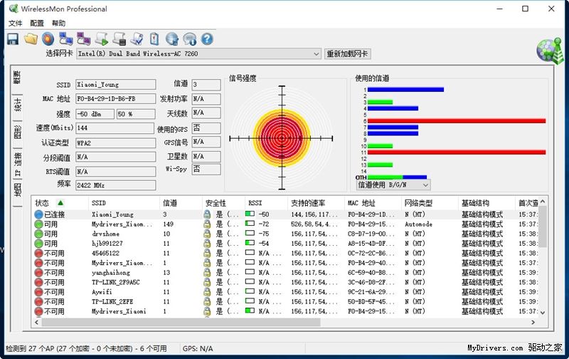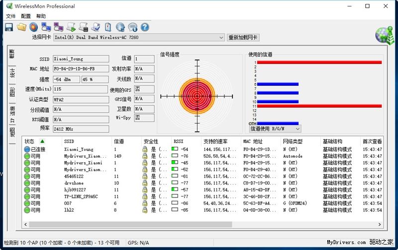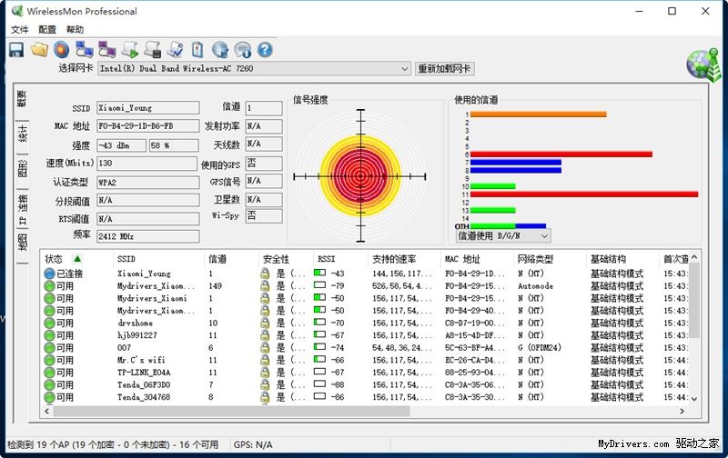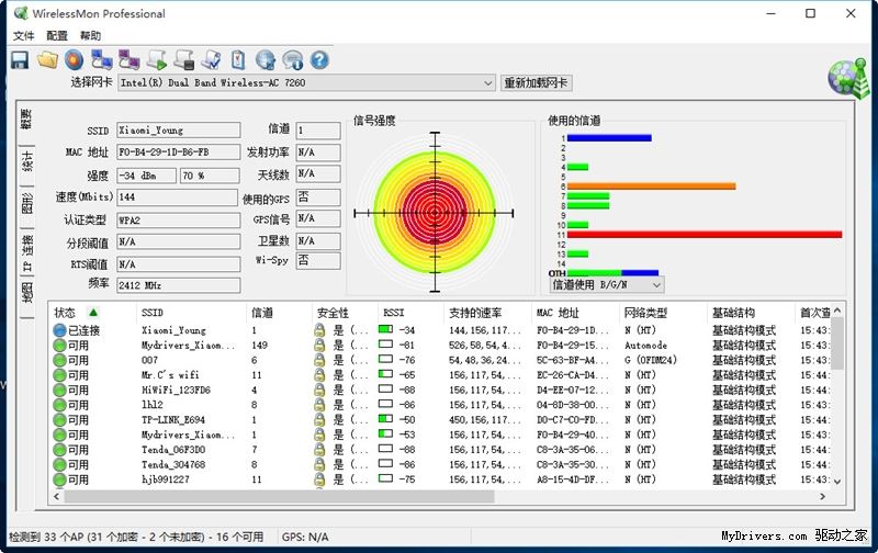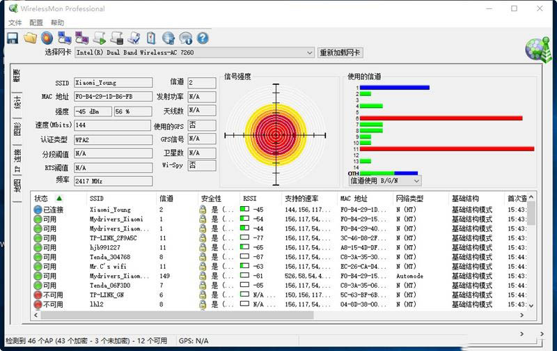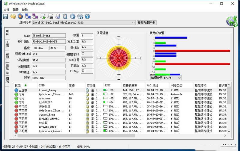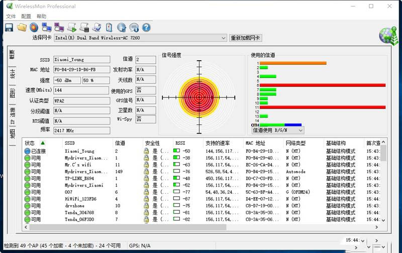 信號(hào)強(qiáng)度方面,我們使用WirelessMon來進(jìn)進(jìn)行測試,信號(hào)強(qiáng)度選擇了小米路由器青春版穿墻、標(biāo)準(zhǔn)以及節(jié)能三種模式,測試地點(diǎn)則選擇了距離路由器1米,距離路由器5米以及距離路由器7米隔堵墻三個(gè)。