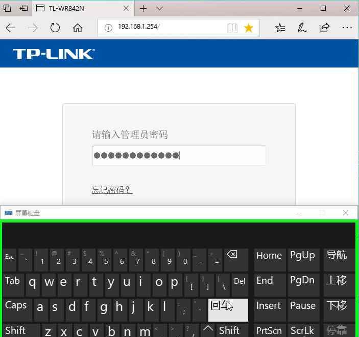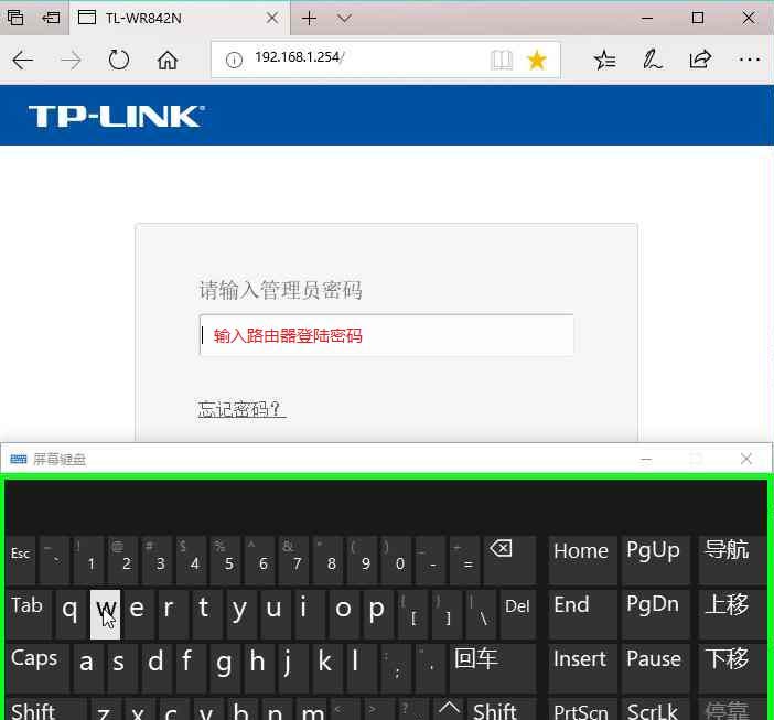 1、首先在"搜索或輸入網(wǎng)址 (編輯)"上左鍵單擊輸入:路由器地址(圖為192.168.1.254)。再在"Enter (按鈕)"上左鍵單擊鍵盤輸入(在"屏幕鍵盤"中)。(在" Microsoft Edge瀏覽器"中)。