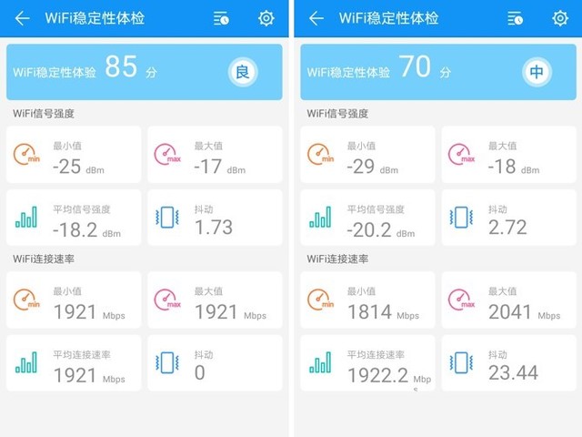 從測試的結(jié)果也可以看出,即使B點(diǎn)距離更遠(yuǎn),隔墻更多,Wi-Fi信號(hào)強(qiáng)度卻依舊能達(dá)到平均-20.2dBm。(dBm為一個(gè)指代功率的絕對(duì)值,為負(fù)值,這個(gè)值越大,表示信號(hào)越好,例如-20dBm要比-30dBm強(qiáng)度更高,信號(hào)更穩(wěn))