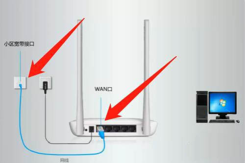 2、然后用網(wǎng)線連接路由器的WAN口與寬帶入口,如下圖所示。