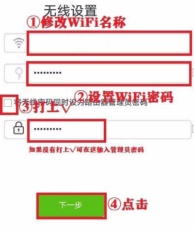 5、修改無線名稱,也可以不修改保持默認,輸入無線密碼,在“將無線密碼同時設為路由器管理員密碼”左邊方框打上√,如果沒有打上√可以在下方輸入管理員密碼,點擊“下一步”;