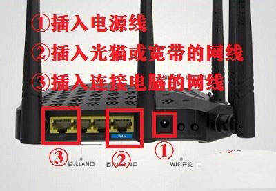 1、騰達ac1200路由器插上電源線通上電,將光貓或寬帶連接的網線插入路由器WAN接口(在電源接口左邊第一個),再用網線插入路由器LAN接口(3個),另一端插入電腦,等待路由器指示燈穩定常亮;