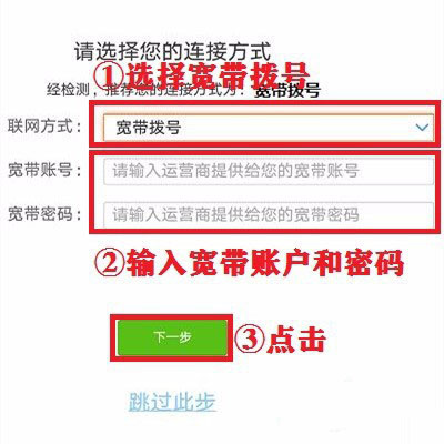 4、選擇“寬帶撥號”的上網方式,輸入寬帶賬戶和寬帶密碼(寬帶賬戶和寬帶密碼從網絡運營商處獲取),點擊“下一步”;
