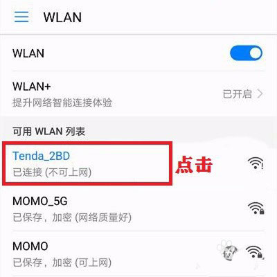 2、打開手機無線網絡(WLAN),點擊連接WiFi名稱格式為:Tenda_xxxx的WiFi;