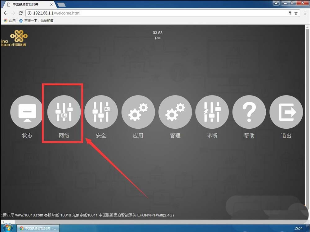 5、進(jìn)入光貓配置界面,點(diǎn)擊選擇“網(wǎng)絡(luò)”