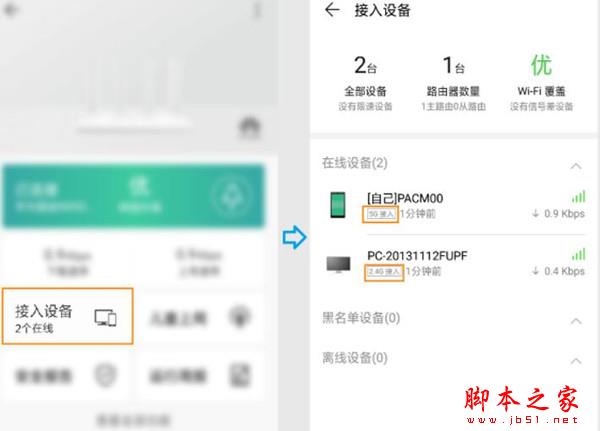 3、點擊“接入設備”,在在線設備列表中查看設備是 2.4G接入還是5G接入。