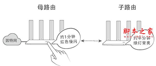 2、觀察母路由的指示燈,等待約1分鐘后它將自動變為紅色慢閃。此時,點按一下母路由的 H(或 Hi)按鍵后松開,指示燈將閃爍加快。當子路由的指示燈變為綠色常亮時,即表示連接成功。
