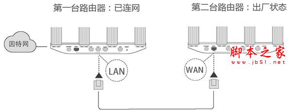 用網線連接第一臺路由器的灰色網口(LAN 口)和第二臺路由器的藍色網口(WAN 口),連接后即可自動完成組網,無需您進行任何手動配置