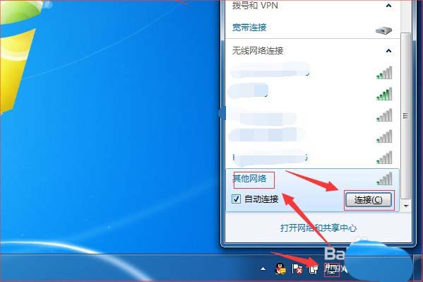 1、其他人搜不到信號,自己也搜不到。需要手動添加。點(diǎn)擊桌面右下角任務(wù)欄上的電腦圖標(biāo),在彈出的頁面點(diǎn)擊“其他網(wǎng)絡(luò)”,然后點(diǎn)擊“連接”。